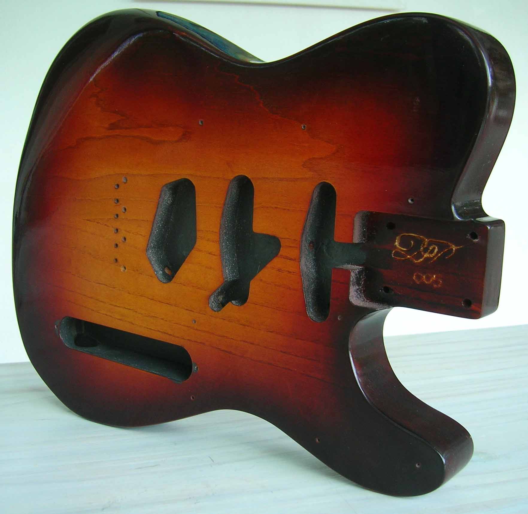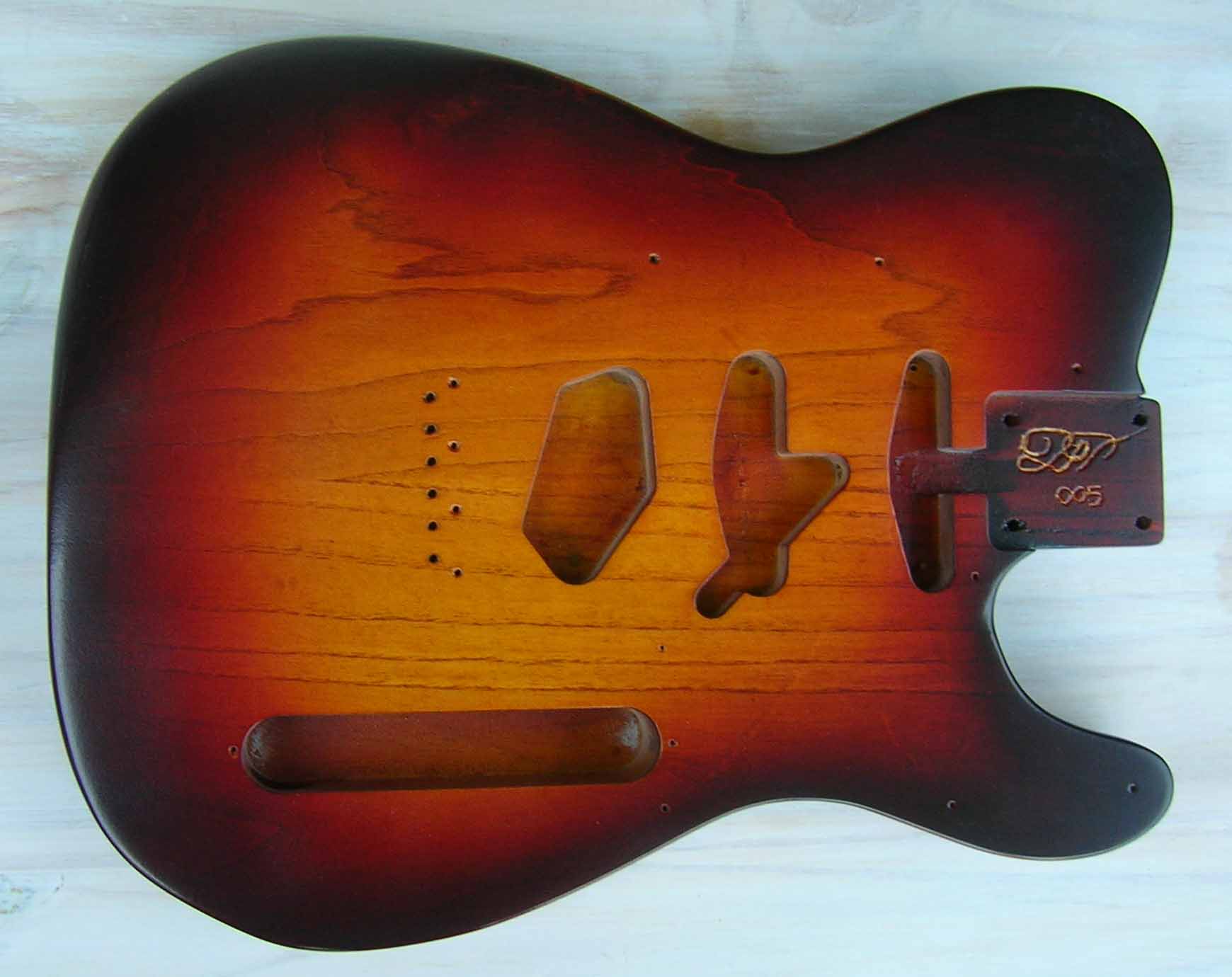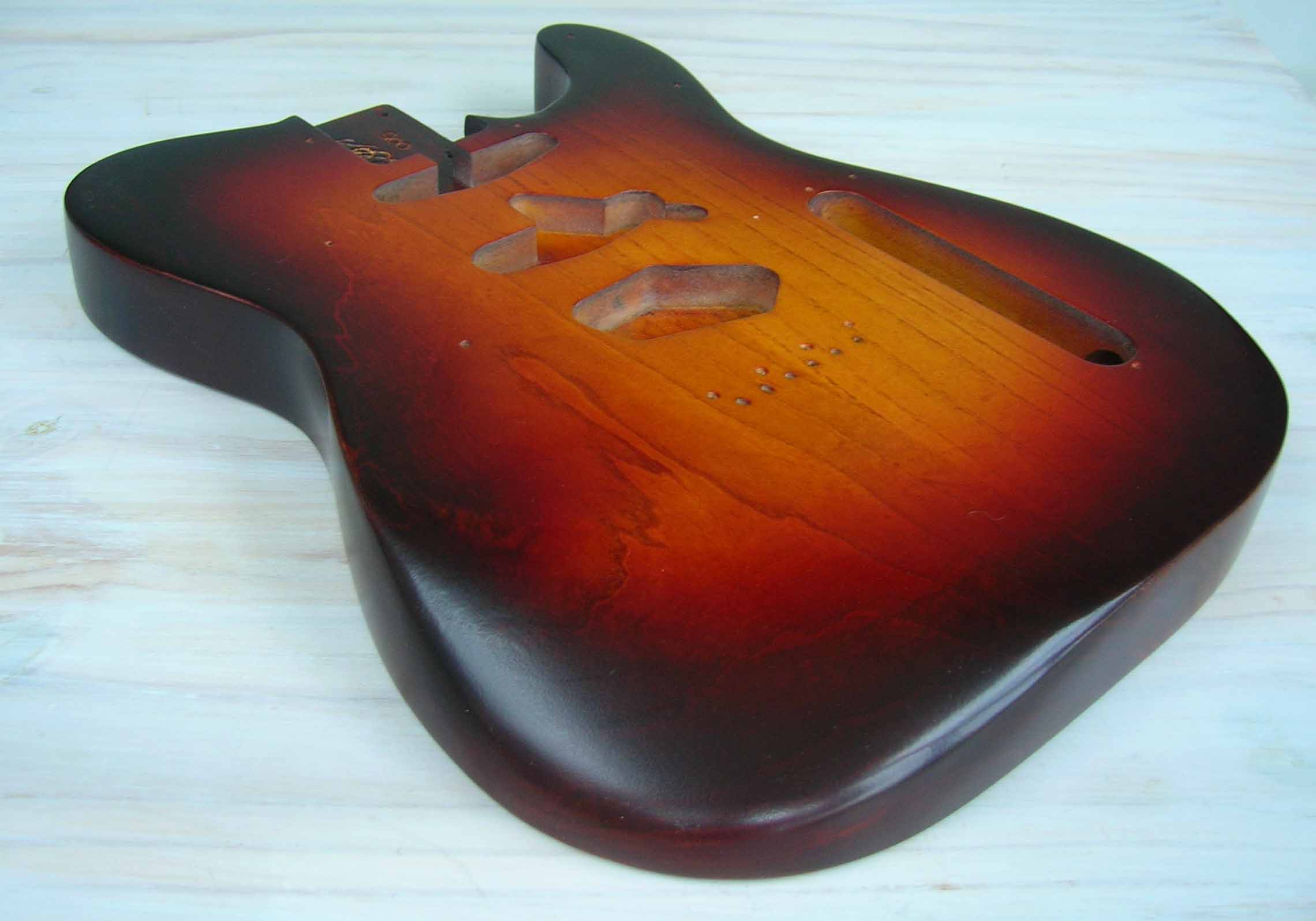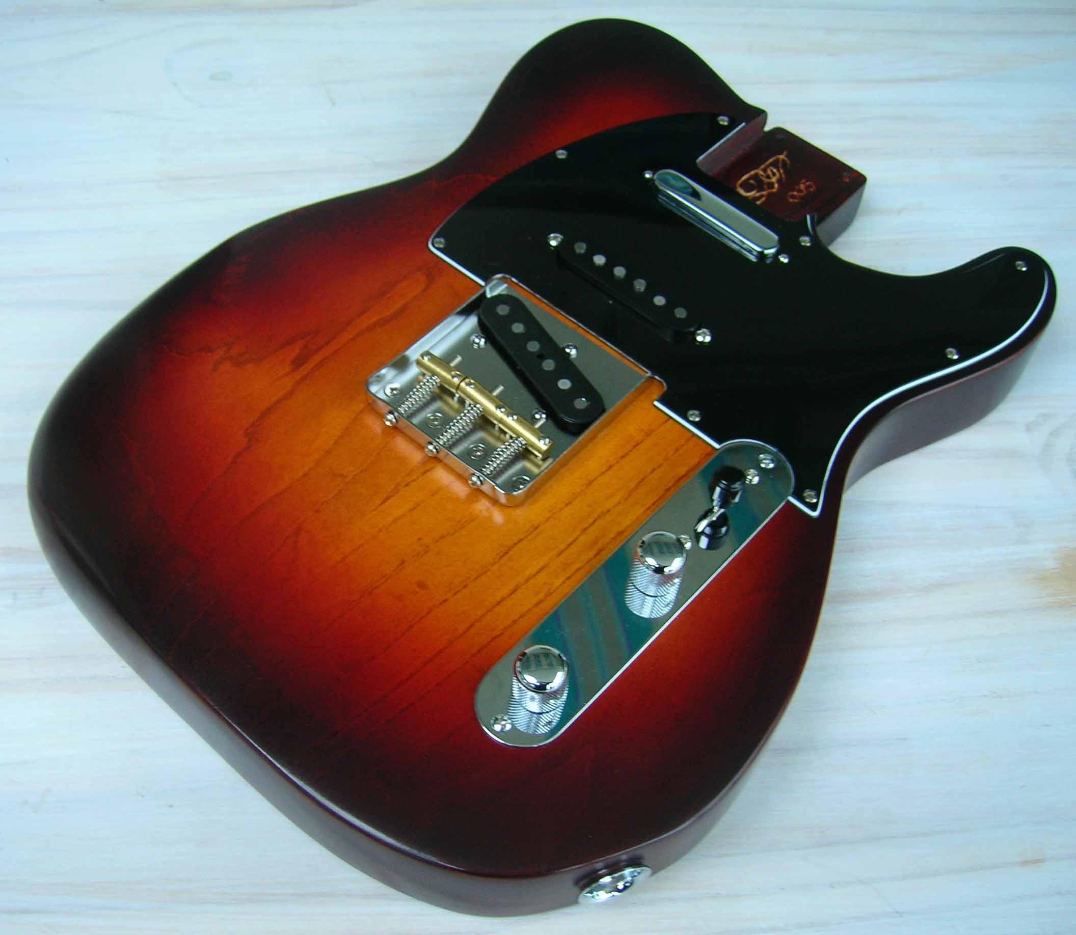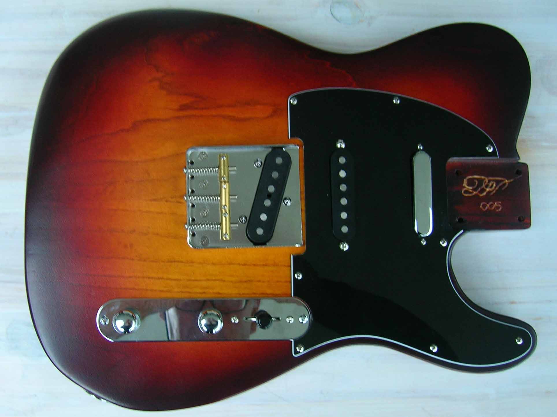 Il s'agit d'un corps luthier en frêne USA des marais de Louisiane (Swamp Ash) 2 pièces, vernis "Luthier" nitrocellulose + gomme laque, des micros d'origine (genuine) Fender USA 52 RI et Texas "SRV", Pickguard noir moderne 3 plis et bloc cordier (bridge) vintage style 3 saddle de chez Steward Mc Donald