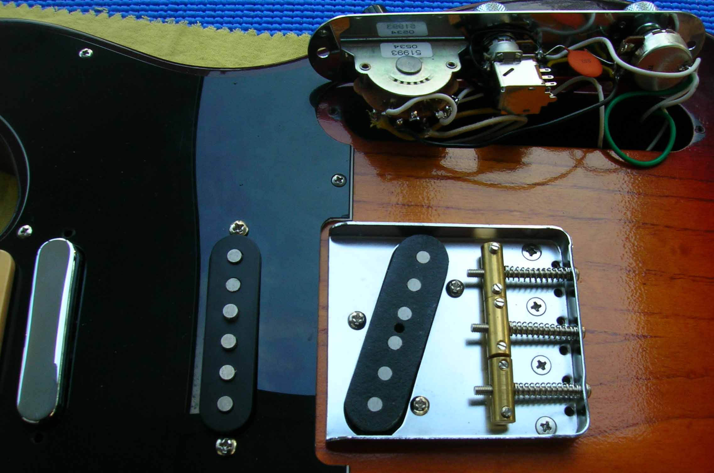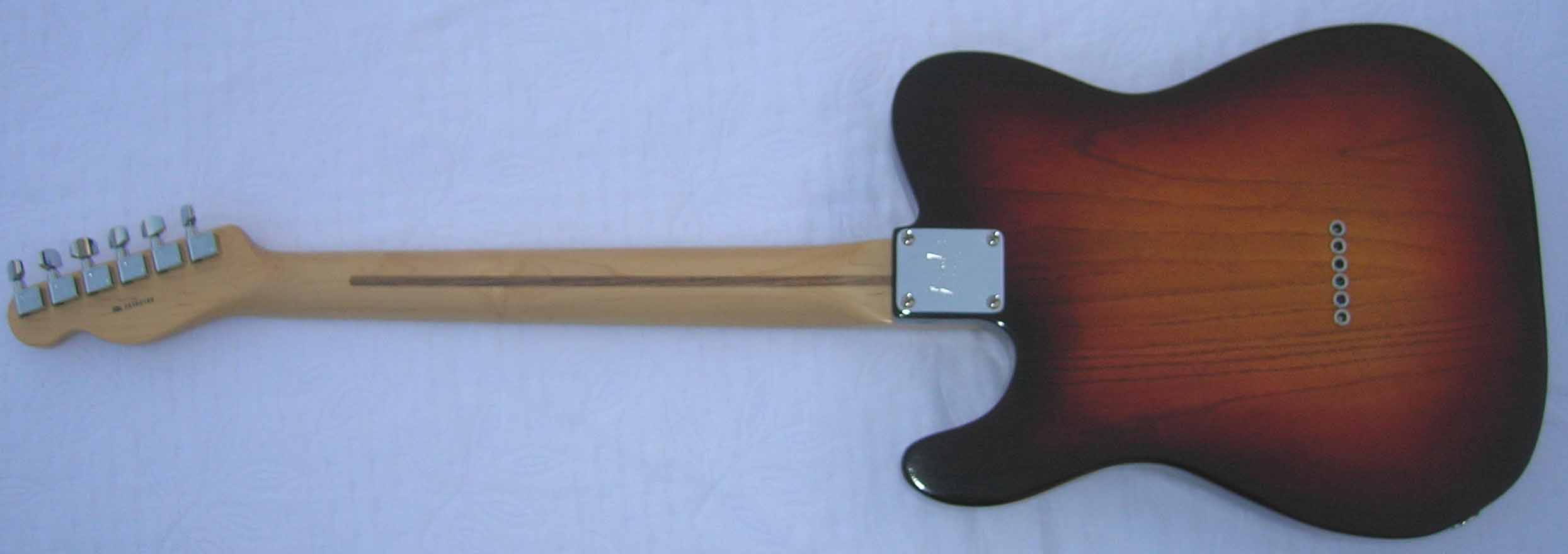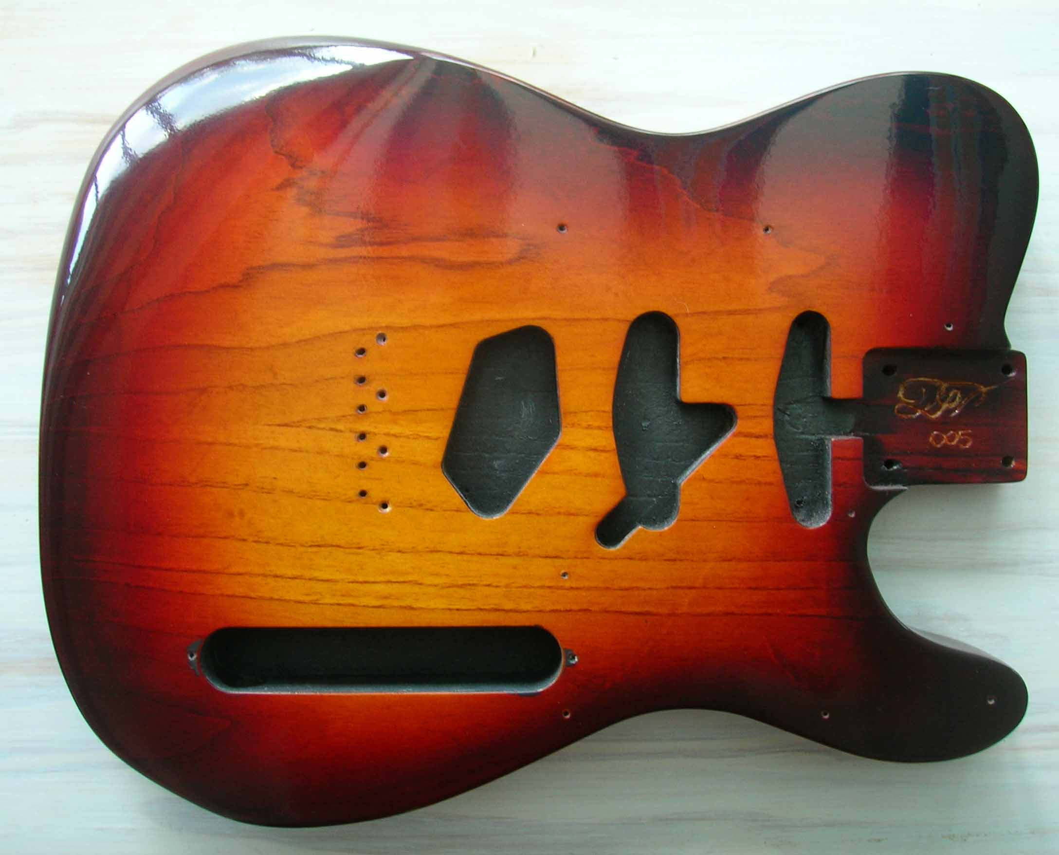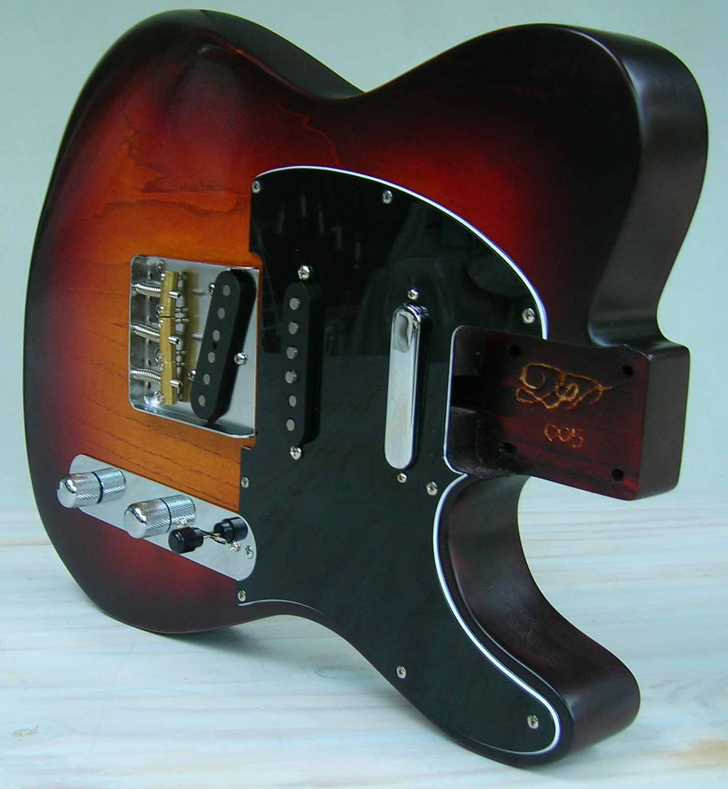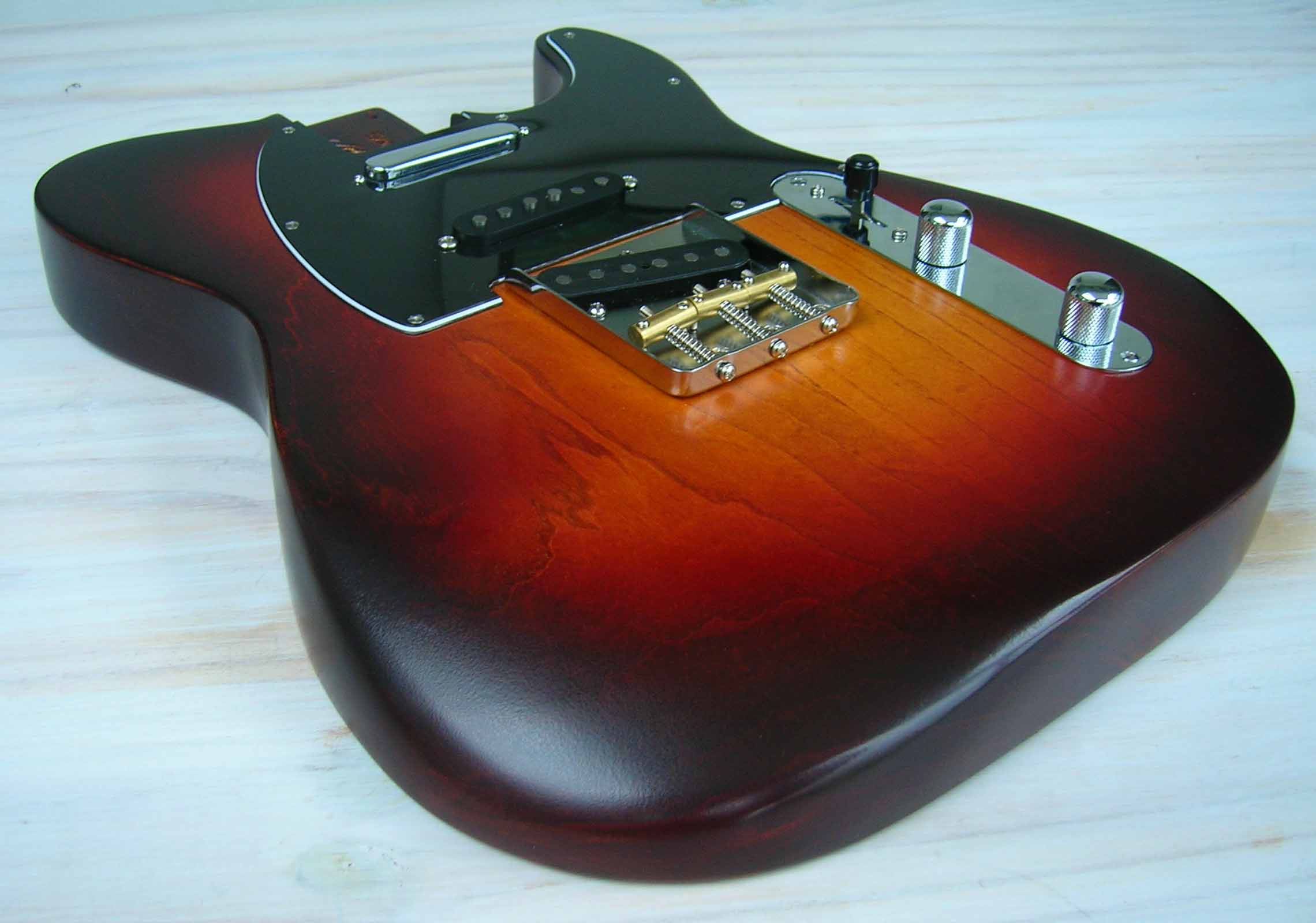 Il s'agit d'un corps luthier en frêne USA des marais de Louisiane (Swamp Ash) 2 pièces, vernis "Luthier" nitrocellulose + gomme laque, des micros d'origine (genuine) Fender USA 52 RI et Texas "SRV", Pickguard noir moderne 3 plis et bloc cordier (bridge) vintage style 3 saddle de chez Steward Mc Donald