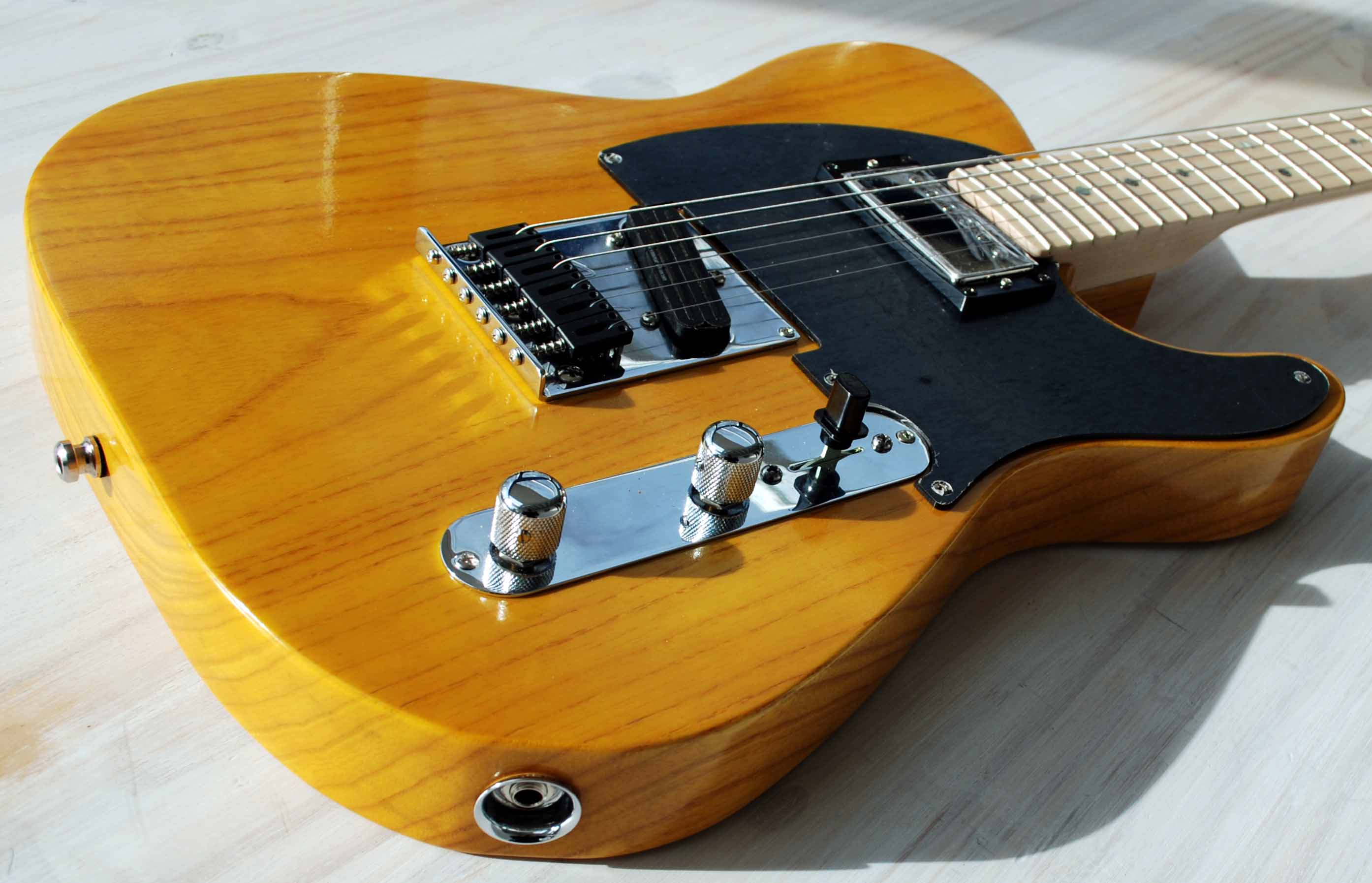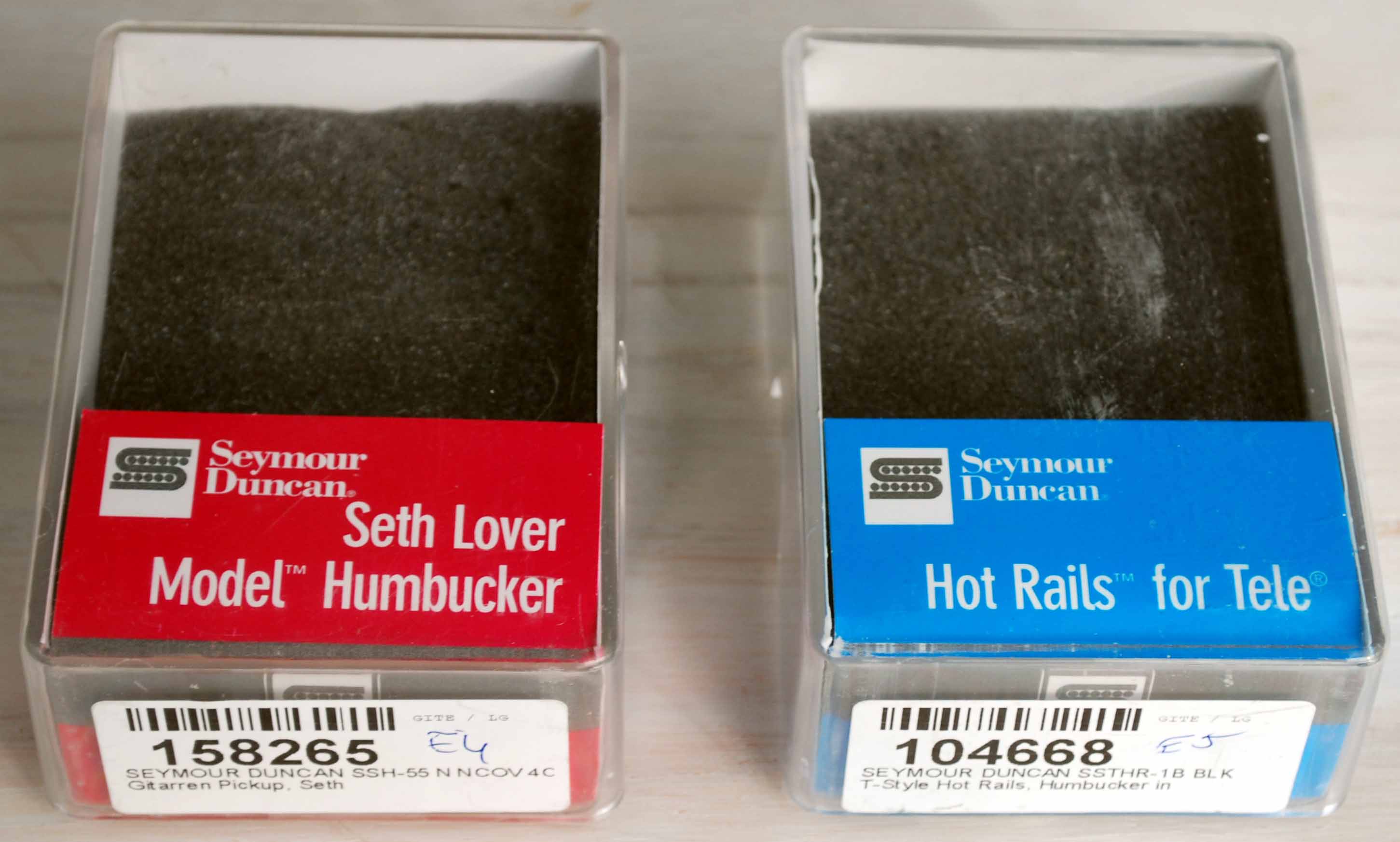 2 humbuckers pickups by Seymour Duncan : Hot rails SSTHR (bridge) and Seth Lover SSH-55 (neck), with split (single coil for tele "twang" or double coil) by push pull on the volume and tone control,