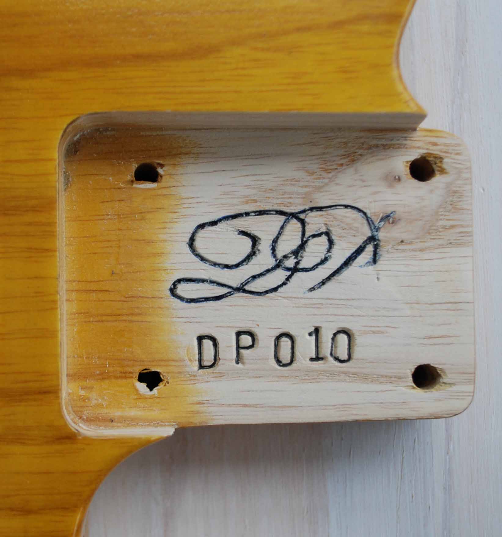 ![]() cliquez sur l'image pour l'agrandir dans une fenêtre séparée Une guitare Custom numérotée "DP010" et signée |