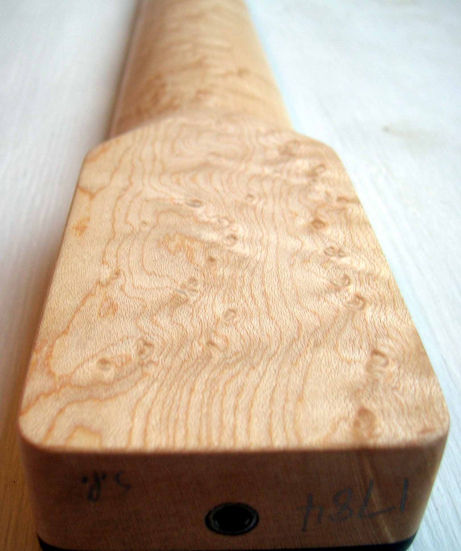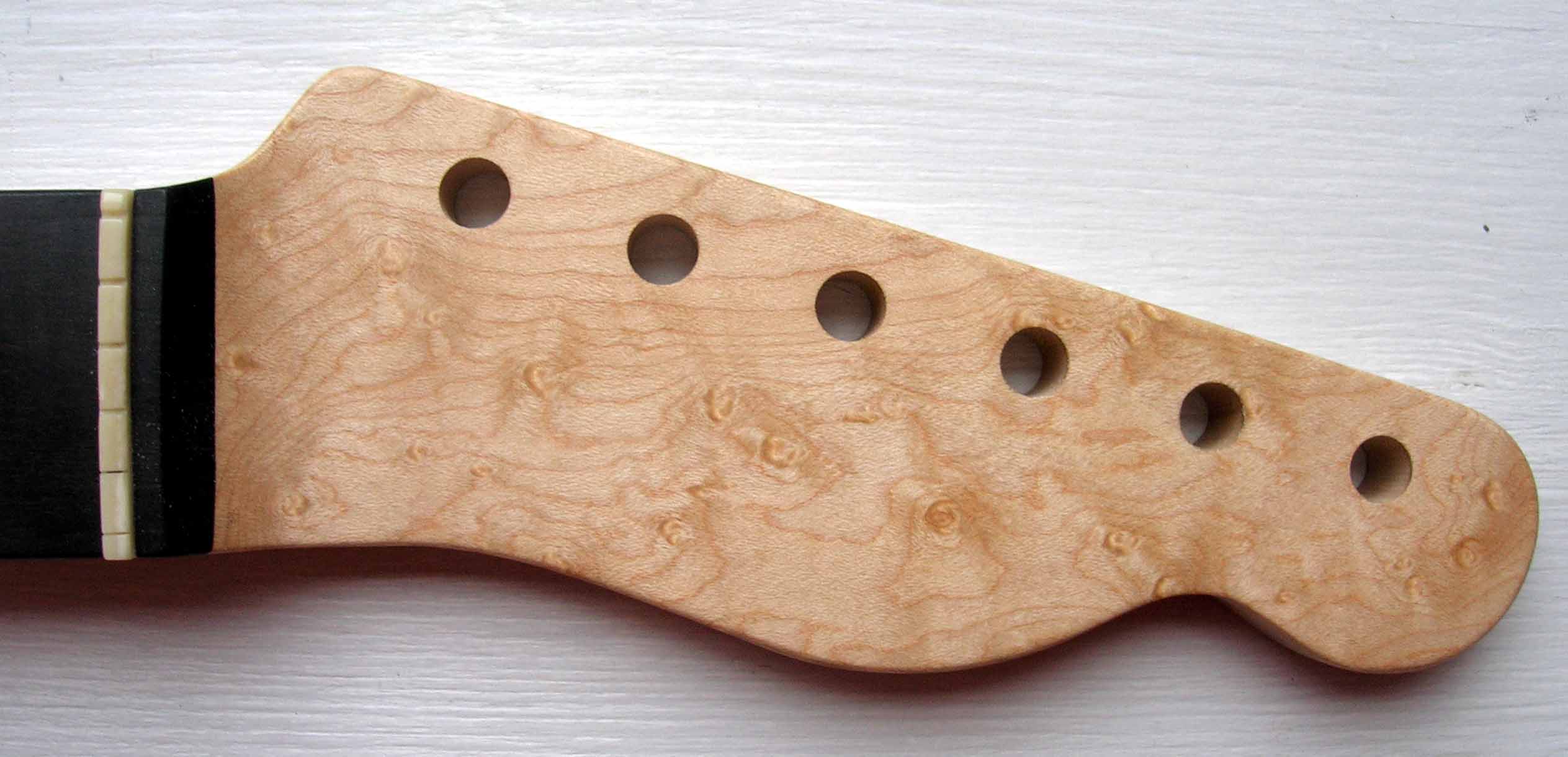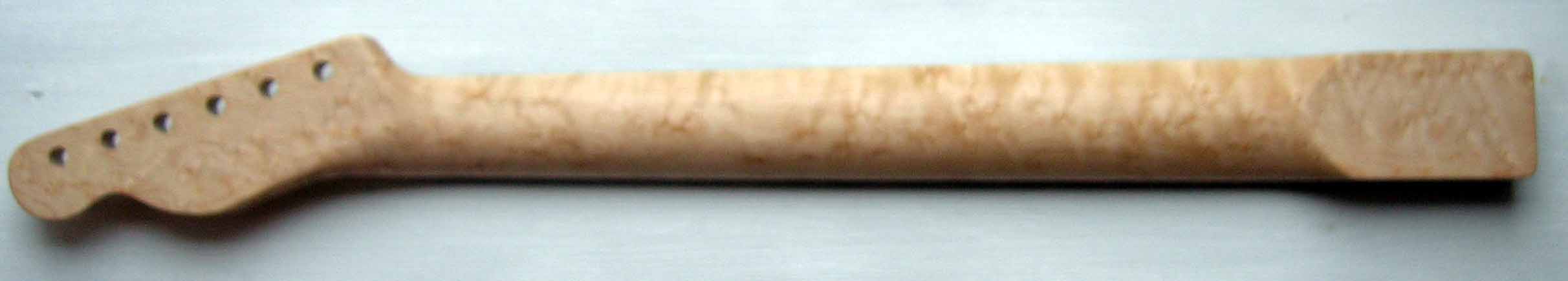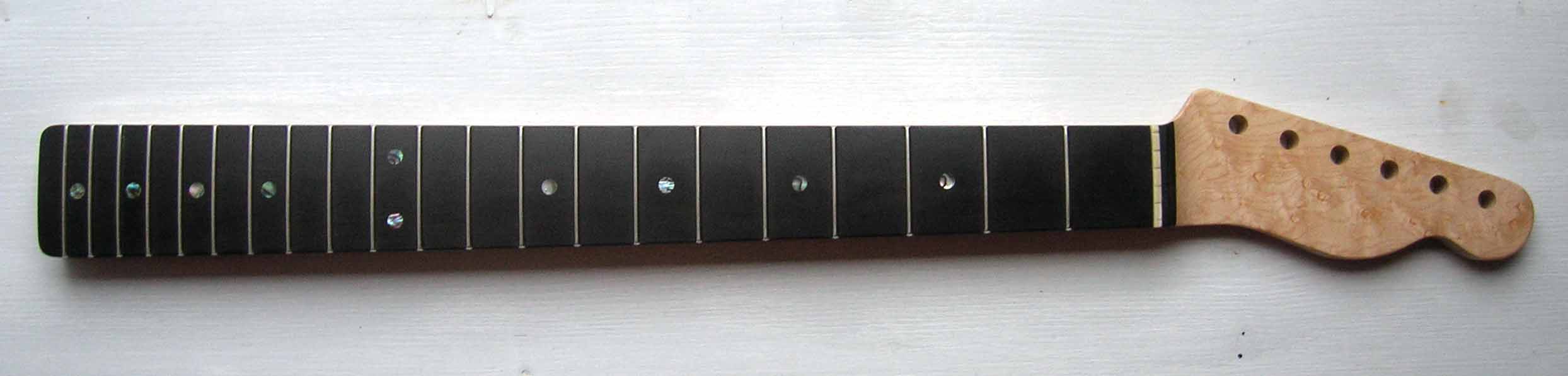 Musikraft "Premium" sera vernis selon votre choix (nitro-cellulose DP) Ce manche exceptionnel sera au moins de la classe d'un Fender DeLuxe, et même au delà (Artists series - ie. GE Smith, Hot Rod, Custom Shop) : Erable moucheté - flamé "byrd's eye", touche en ébène noir avec incrustation d'abalone, sillet en os (offert). Profil de type "American Standard": Radius 9,5", 21 frettes "Medium 6105" contour "medium C" avec une épaisseur du manche de 83" (21,12 mm) à la 1 ere frette to .92" (23,4 mm) à la 12 eme. Largeur du manche 1 11/16" au sillet et 2 3/16" au bout du talon. Truss rod double action réglable au talon. Un manche de rêve !! valeur avec vernis cellulo : 375 + 50 euro options (Custom 5) = 425 euro (mécaniques non comprises)