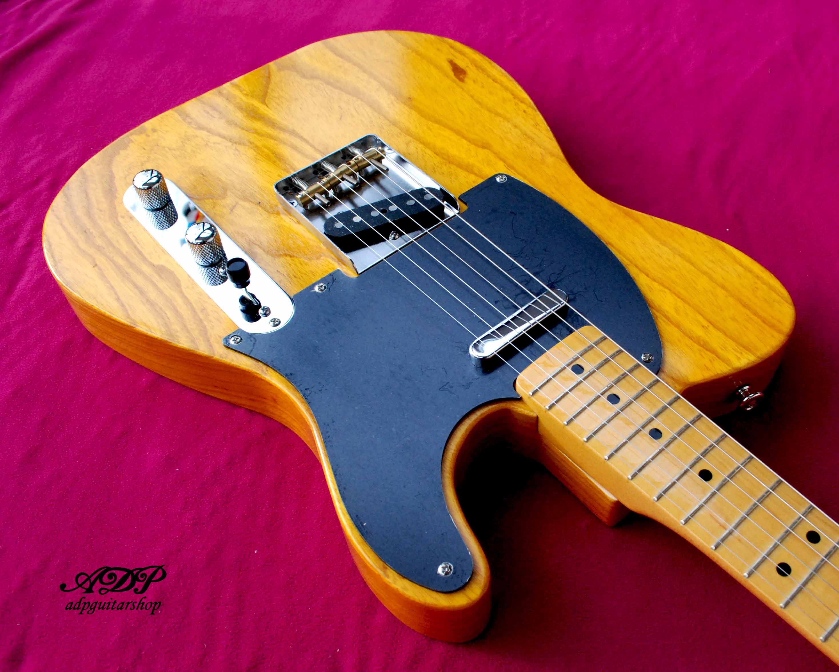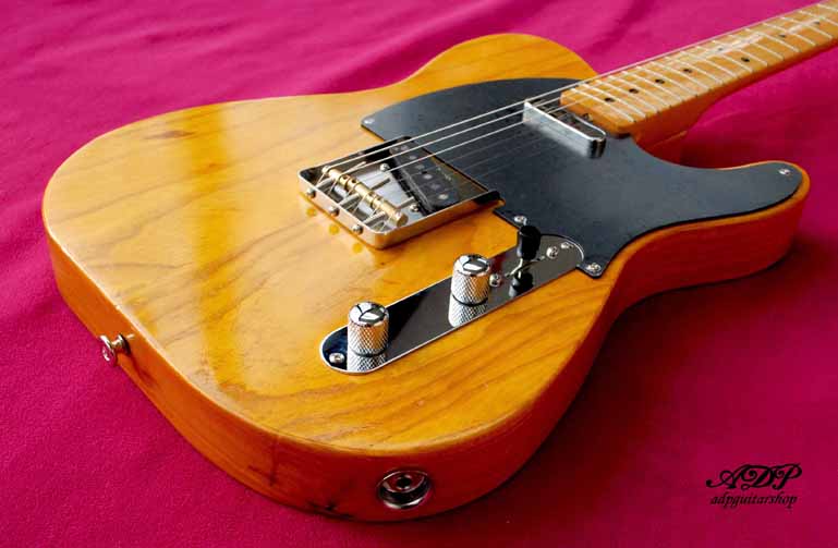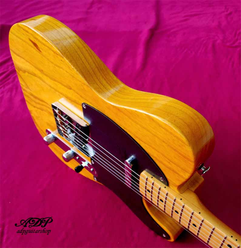 Musikraft produit des corps et des manches labellisés "Blackguard" conformes aux spécifications de ces premiers modèles. Je vous propose ici une guitare librement inspirée de ces guitares mythiques. Le manche et les micros sont des pièces Fender® authentiques provenant d'un 52 RI Japon (US pour les micros). Le corps est un Blackguard usiné aux USA par Musikraft et vernis par nos soin. Notre couleur "baptisée "Honey-Scotch" se différencie légèrement du traditionnel Buttersctch de Fender. le vernis est plus transparent. la gomme lacque donne un brillant particulier et relève les veines du bois. Le Vernis "Luthier" Cellulosique-gomme laque assure un brillant exceptionnel, une sonorité optimale tout en offrant la solidité des composants cellulosique dont ne bénéficient pas les violons traditionnels, tamponnés à la gomme laque. Ce modèle permet à un acheteur qui ne peut se payer le modèle avec manche Fender US et Crps 1PC d'acceder cependant à une guitare "a la manière de" ces guitares mythique pour un prix raisonnable.