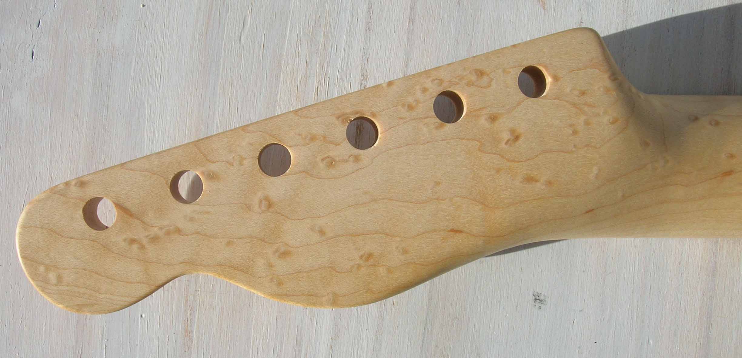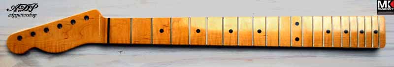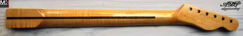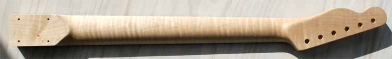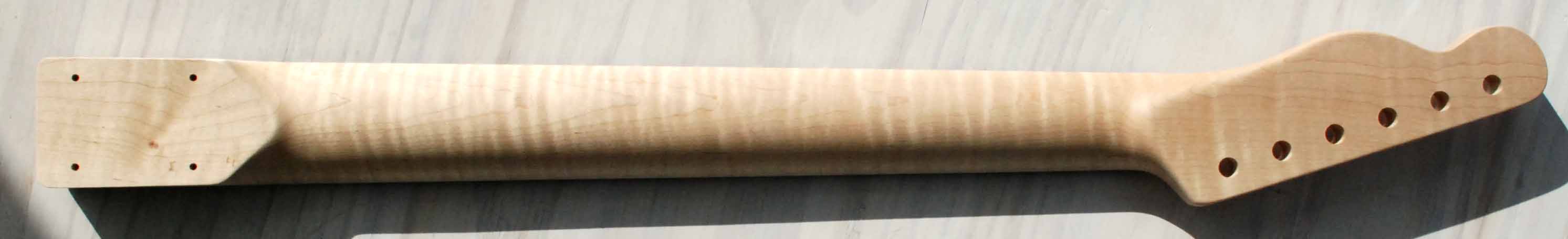 Musikraft "Select" (4 - disponible) : Erable flammé, touche palissandre indien sera vernis vtaille : 25-1/2" (Standard Fender) 21 frettes Medium 6105; Largeur Standard Fender (au sillet: 1-11/16" au talon: 2-3/16") perçage pour des mécaniques vintage 11/32" (type Kluson). Trussrod Double action réglable au talon. Radius: 10". contour "Thin C" (fin) avec une épaisseur du manche de 79" (20 mm) à la 1 ere frette et de .89" (22,6 mm) à la 12 eme. Incrustations : Nacre. Sillet de chez GraphTech fournis valeur avec vernis cellulo : 355 euro (mécaniques non comprises)