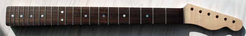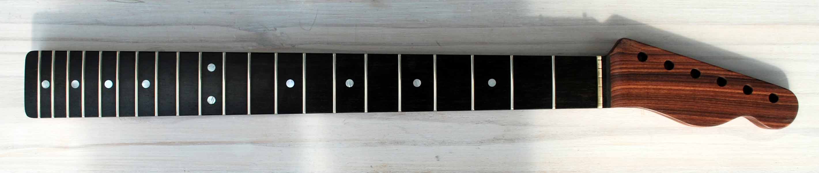 Musikraft brut (1) Manche "Private Reserve" Private Reserve Pau Ferro (Bois Brésilien rare très dense (1 100 gr/dcm) proche du palissandre mais plus rigide, il est utilisé pour les archets de violon), touche en ébène noir avec incrustation de nacre, Sillet en Os.: sera vernis (nitro-cellulose DP) Ce manche dans un bois rare et protégé d'une qualité exceptionnelle est certainement supérieur aux Fender haut de gamme (Artists series - ie. GE Smith, Hot Rod, Custom Shop). Profil : Radius 10", 21 frettes "Medium 6105" contour épais en "C": .90" (22,8 mm) à la 1ere frette à .98" (24,89 mm) à la 12 eme. Largeur du manche 1 11/16" au sillet et 2 3/16" au bout du talon. perçage pour des mécaniques vintage 11/32" (type Kluson). Truss rod double action réglable au talon. Un manche de rêve !! valeur avec vernis cellulo : 465 euro (mécaniques non comprises)