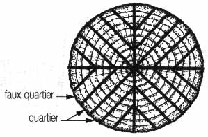 Le terme Quarter-sawn (débit au quartier ) est utilisé pour désigner un coupe radiale, du centre vers la périphérie. La grume est coupée en quatre et chaque quartier est débité en planches. l'axe de coupe est parallèle aux rayons ligneux qui se propagent à partir du centre. Le fil d'un manche quarter-sawn (a droite) est perpendiculaire à la touche, et les veines sont beaucoup moins apparente que dans une coupe flat-sawn (à plat ou "sur dosse") ou les veines du bois sont disposées de gauche à droite, parallèlement à la touche (droite). Le type de coupe affecte la consistance interne (densité) et la rigidité. Un manche quarter-sawn a un fil plus serré ce qui le rend plus résistant et plus stable qu'un manche découpé à plat. Le bois quarter sawn est généralement très plat et rigide alors que le flat sawn est plus souple. Le débit sur quartier, qui assure un faible retrait du bois et très peu de déformation, est considéré en conservation comme un débit de meilleure qualité qu'un débit sur dosse, mais ce dernier est cependant apprécié en lutherie pour la sonorité. Chaque type a donc un avantage spécifique. Grâce à sa rigidité et à sa force, le quarter sawn est plus adapté pour les cordes à tirant fort, les manches avec un truss rod double action et les manches long (basse). Il y a aussi une différence de sonorité avec ces types de découpe. Le quarter sawn a une sonorité plus brillante, liée à la densité plus importante (le manche est plus lourd). Un manche coupé sur dosse tends à avoir une sonorité plus douce et mélodieuse; il est plus souple et mieux adapté au truss rod simple action. Du point de vue esthétique, les veines du bois sont plus visibles avec une coupe à plat qu'en qu'au quartier. Lees manches flammés ou birdseye sont plus souvent coupés sur dosse.
